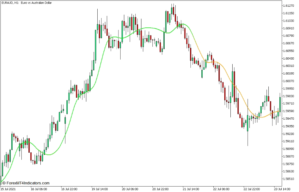 The Smoother Adaptive Indicator plots a line which changes color depending on the direction of the momentum. It plots a line with a lime hue whenever it detects a bullish momentum, which may gradually change to an orange hue as the indicator starts to detect a bearish momentum.