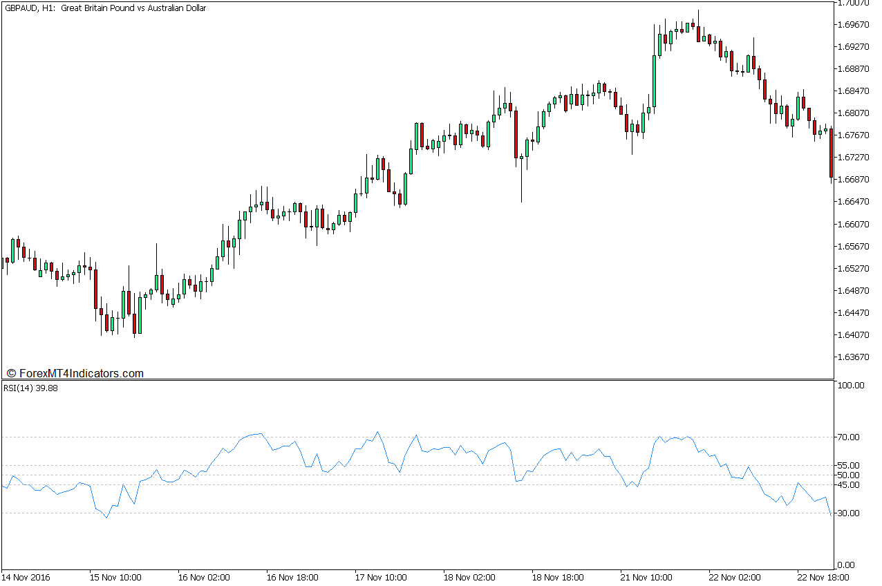 Some traders though would modify the markers on the RSI to make it suitable for indicating trending markets. These added levels are 45, 50, and 55. In an uptrend market, the RSI line would usually be above 50 while level 45 would usually act as a support level for the RSI. On the other hand, the RSI line would usually be below 50 in a downtrend with 55 acting as a resistance level for the RSI. Traders can also confirm the resumption of an uptrend based on the RSI line breaking back above 55 and the resumption of a downtrend based on the RSI dropping below 45. However, in a market with a very strong uptrend, the RSI line would usually be above 55, and in a market with a very strong downtrend, the RSI line would usually be below 45.