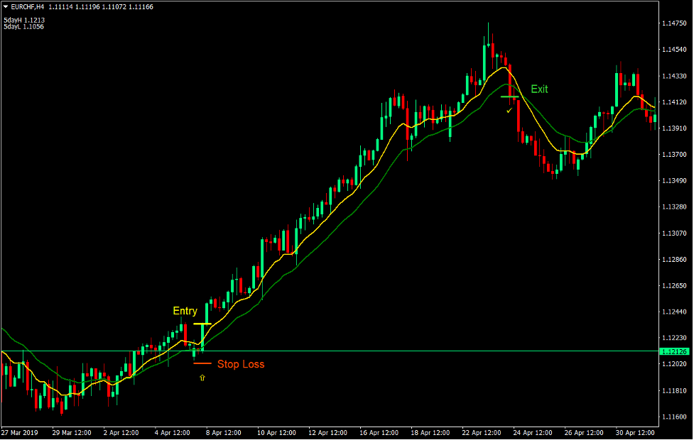This strategy differs in a couple of ways. First, the support or resistance line is based on a moving 5-day high and low. This makes the trading strategy dynamic, allowing traders to trade any day of the week. It also bases its exit on the reversal of a moving average crossover. This removes all the guess work of trailing the stop loss or closing the trade based on price action.
