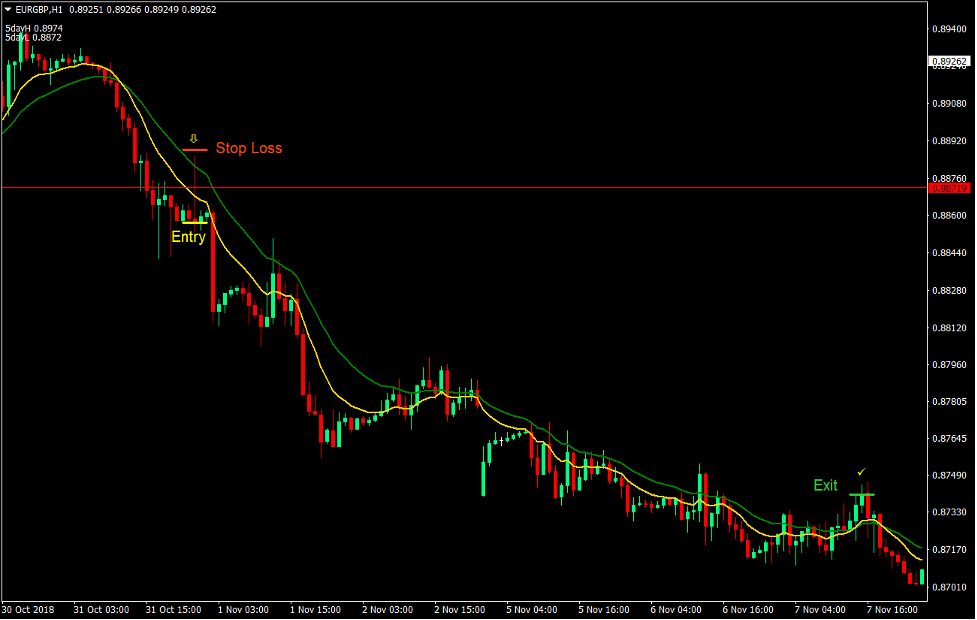 The trade is then kept open as long as the 10-period Exponential Moving Average and 20-period Exponential Moving Average (EMA) lines does not reverse.