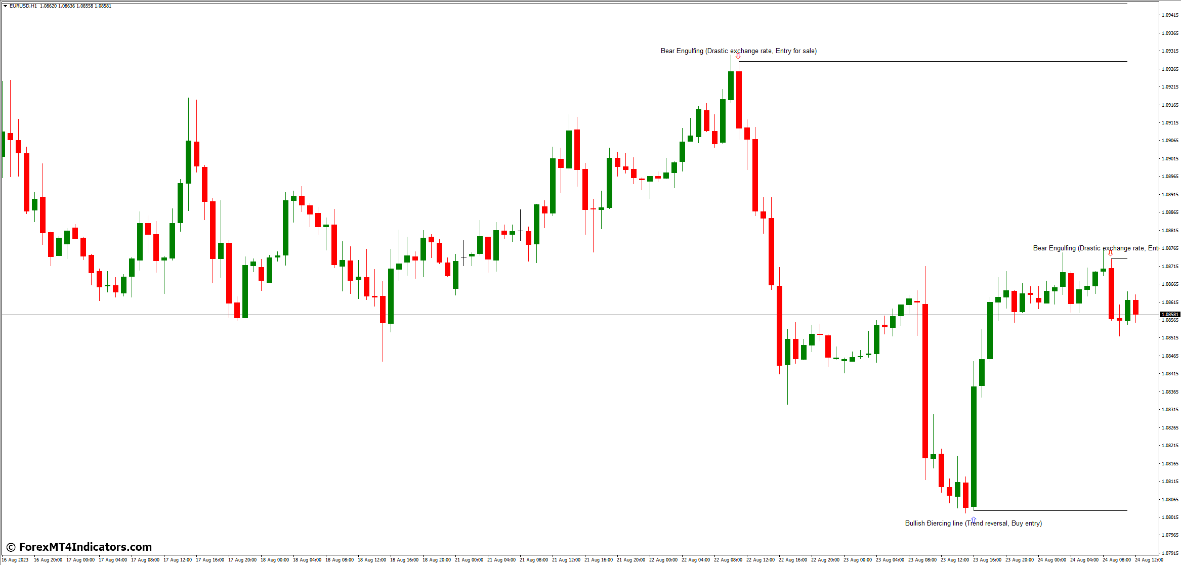 - Piercing Line: Bullish candle closes over halfway up previous bearish candle.
