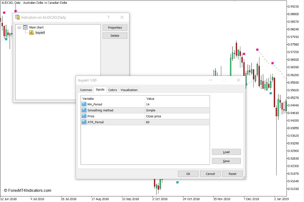 The Buy Sell Indicator uses a moving average line and an Average True Range (ATR) indicator to identify trend direction. It uses the moving average line as the starting point on which it would base where it would plot the dots from. The dots are plotted a distance from the moving average line based on the ATR. The dots shift above or below price action once a candle closes beyond the dots. This would signal that the market is about to reverse.