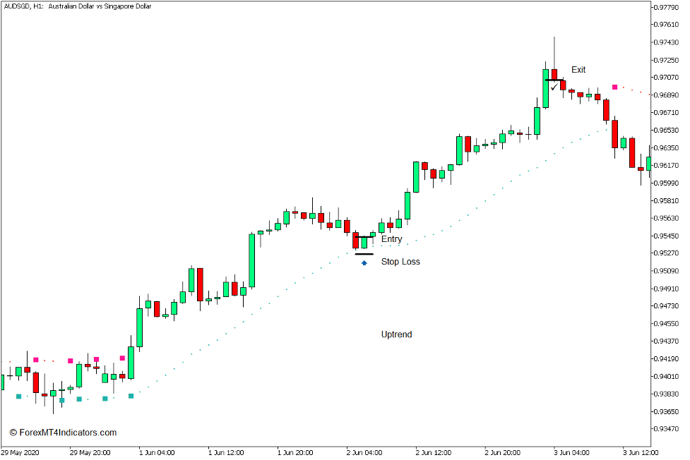 The Buy Sell Indicator can be used as a trend reversal signal indicator based on the shifting of its dots above or below price action. However, it is best used as a trend direction filter wherein traders would simply identify the direction of the trend using the Buy Sell Indicator and trade exclusively in the trend direction it indicates.