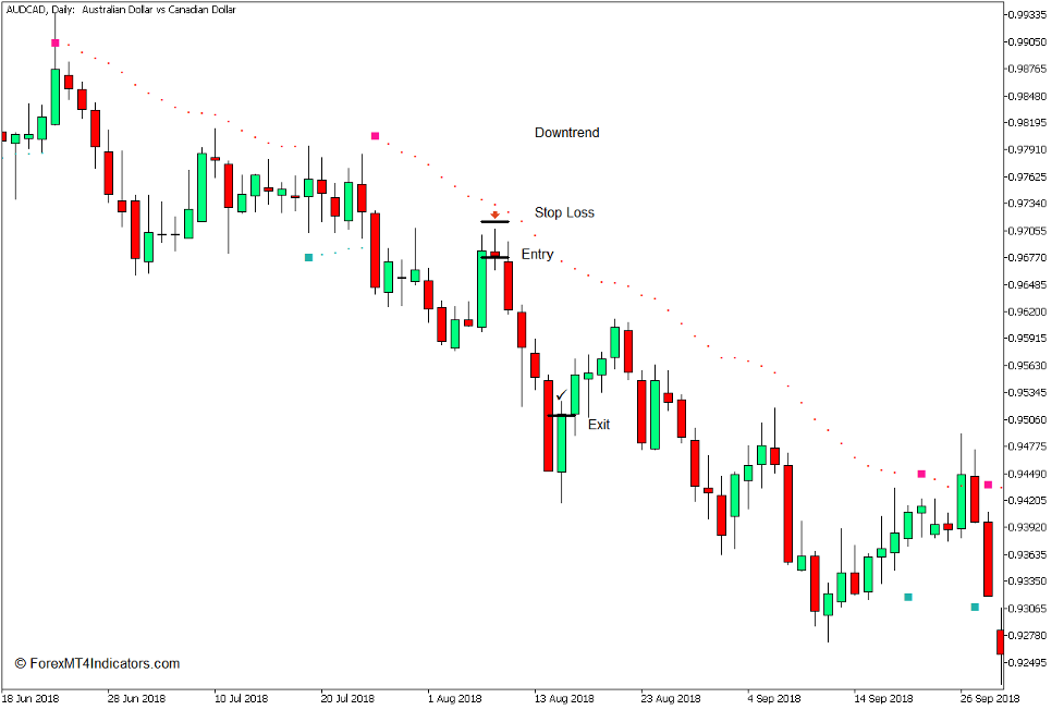 Identify a market which is trending down using the Buy Sell Indicator dots. Wait for price to pullback near the dots. Open a sell order as soon as price action shows indications that the downtrend is about to resume. Set the stop loss on the resistance above the entry candle.