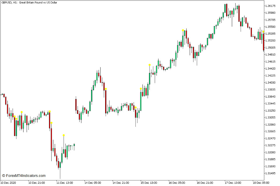 This technical indicator identifies a large candlestick by plotting a yellow dot above the identified candlestick.