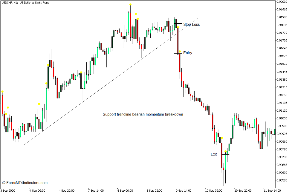 Identify a trade setup which requires a bearish momentum breakout to confirm the trade. Open a sell order on the confluence of a bearish momentum candle and a dot placed by the indicator. Set the stop loss above the entry candle.