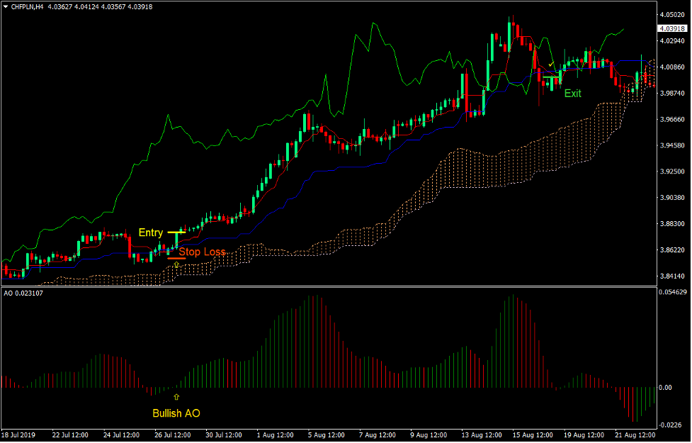 Then, we wait for retracements. Retracements should cause the Tenkan-sen and Kijun-sen to temporarily reverse. The AO should also temporarily reverse along with the two lines. Trades are taken as soon as the short-term and mid-term trend resumes the direction of the long-term trend.