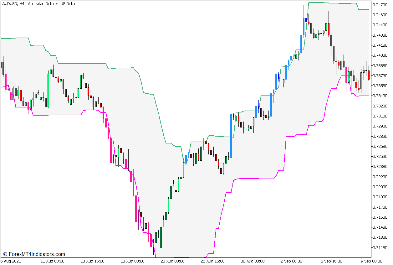 The Donchian Channel Systems Indicator differs slightly from the classic Donchian Channel Indicator since it shifts the lines that it plots forward. This allows traders to visually identify newly formed swing highs and swing lows. It plots a deep pink bar whenever a bearish price candle forms a new low dropping below the lower line, and a purple line whenever a candle that is below the lower line forms a bullish candle. Inversely, it draws a dodger blue bar whenever a new swing high is formed, and a medium blue bar whenever a bearish candle forms above the upper line.