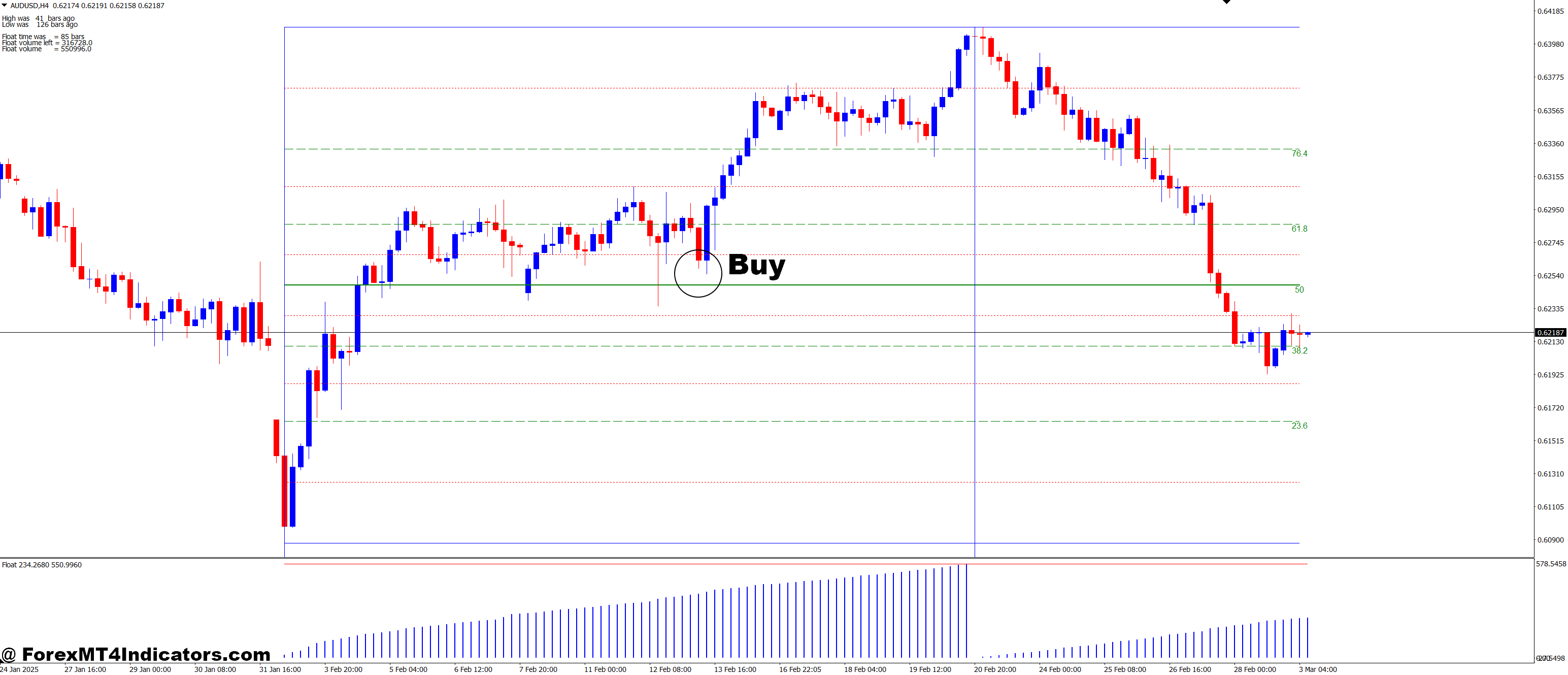 The Float MT4 Indicator shines in trend analysis. It measures trading volume percentages. Rates above 50% signal strong buying pressure and possible price increases.