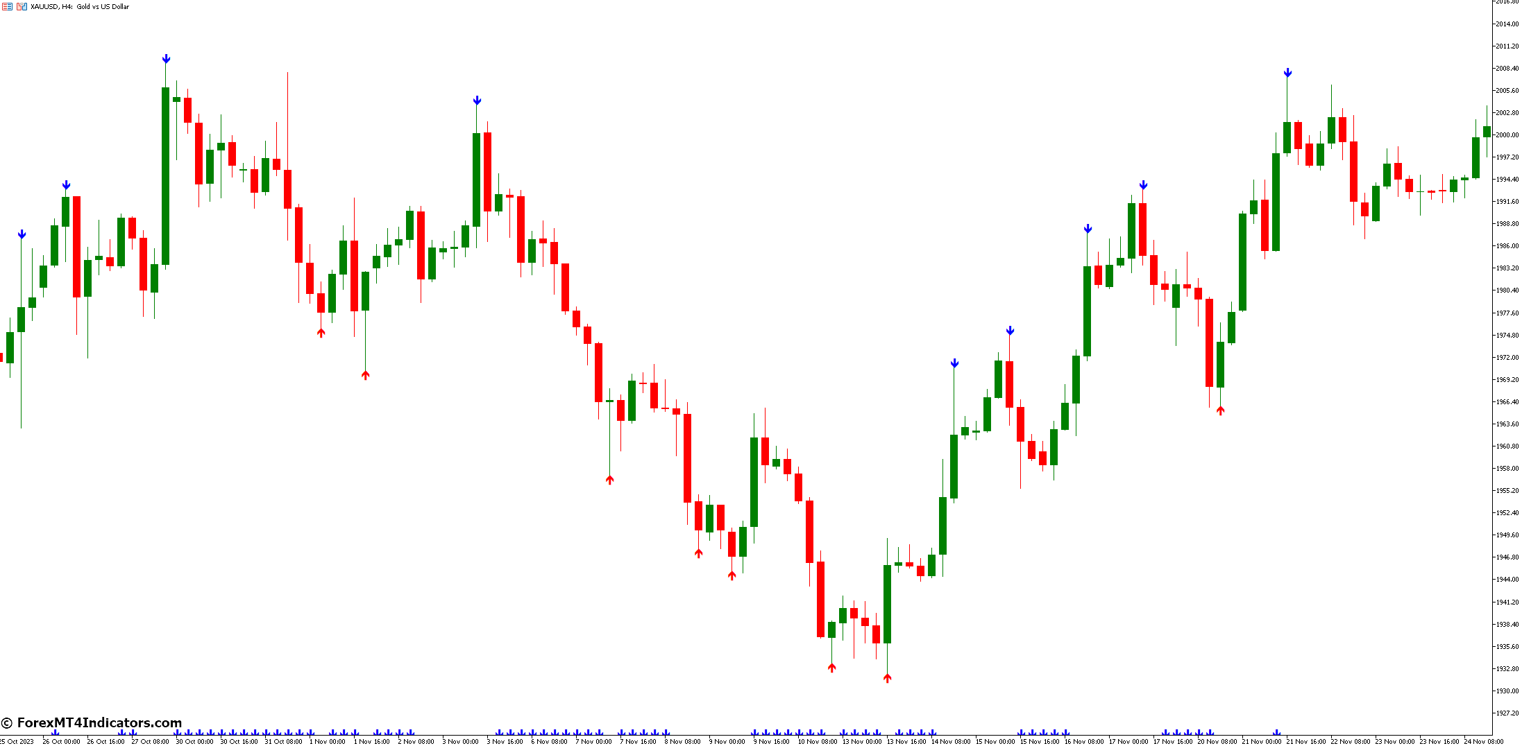 - Confirmation Signals: The indicator’s arrows visually represent potential trend continuations. A bullish arrow following a swing low suggests a possible uptrend extension, while a bearish arrow succeeding a swing high hints at a potential continuation of the downtrend.