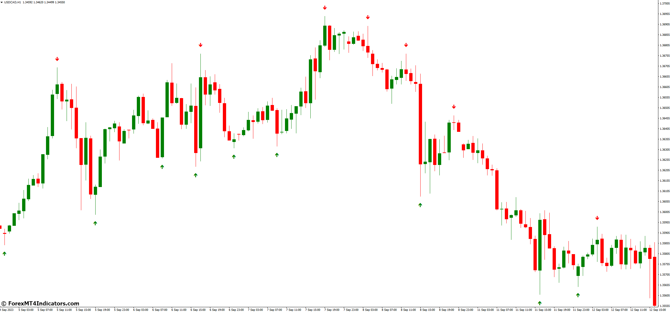 This indicator places arrows on the price chart, indicating potential entry and exit points. When an up-arrow appears, it signals a potential bullish reversal, suggesting that it may be an opportune time to buy. Conversely, a down arrow indicates a potential bearish reversal, signaling a potential selling point.