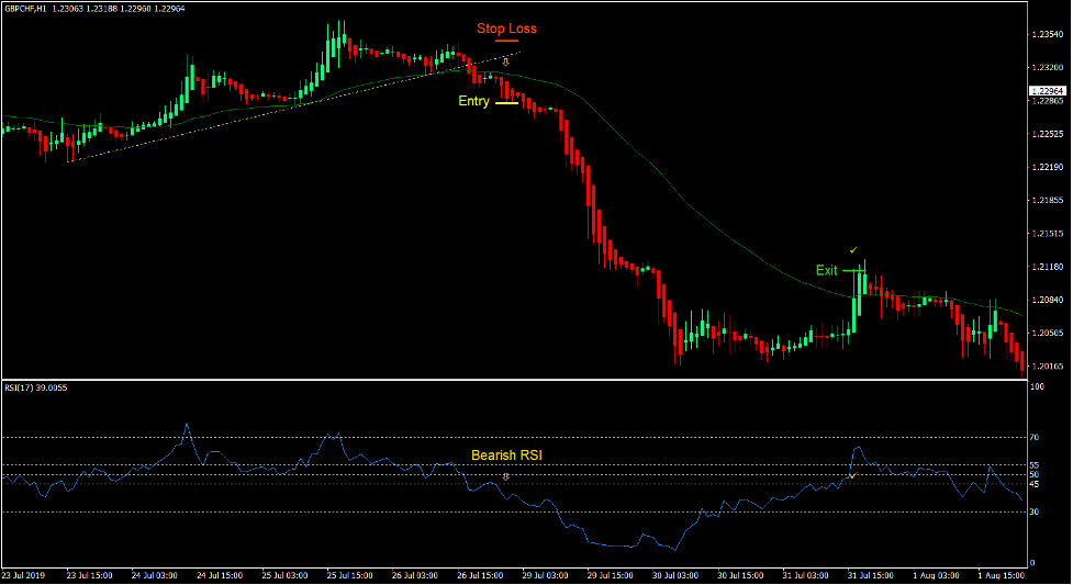 - Set a sell stop order at the low of the Heiken Ashi Candlestick upon the confirmation of these conditions.