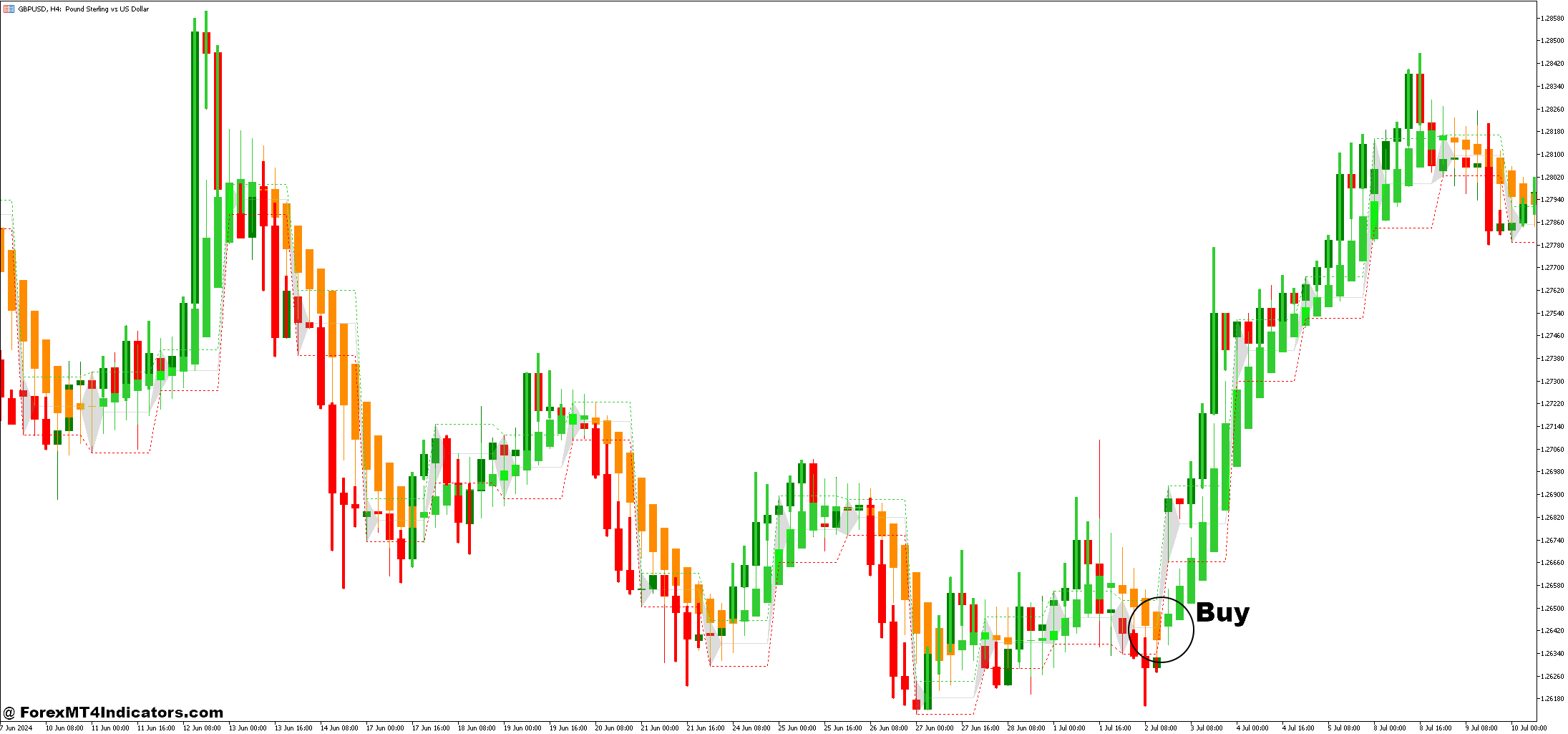 - Enter the trade once the price breaks above the upper boundary and the Heiken Ashi Smoothed candles are green, confirming the bullish trend.