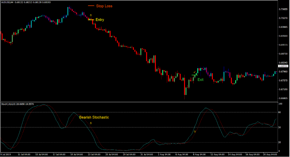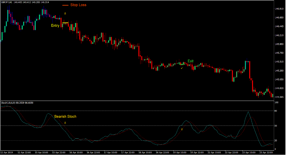 - Close the trade as soon as one line of the Stochastic Oscillator crosses above 50.