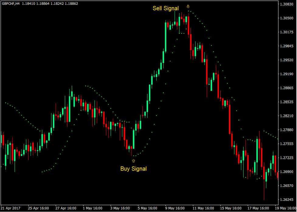 Traders may enter a buy order as the dots shift below price action. We may also enter a sell order as soon as the dots shift above price action.