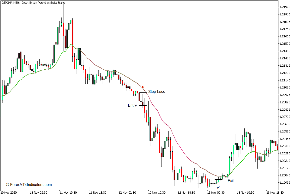 Close the trade as soon as price action shows signs of a bullish reversal and the color of the moving average line starts to change.