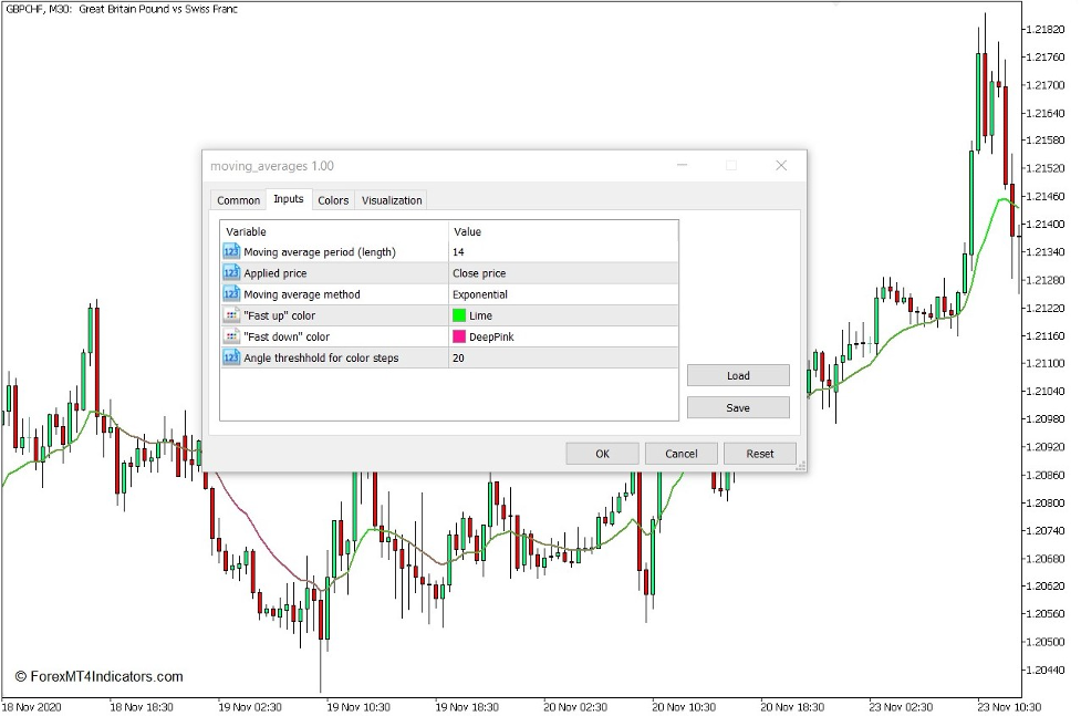 It also allows traders to change the colors used on the moving average line on the “Fast Up Color” and “Fast Down Color”.