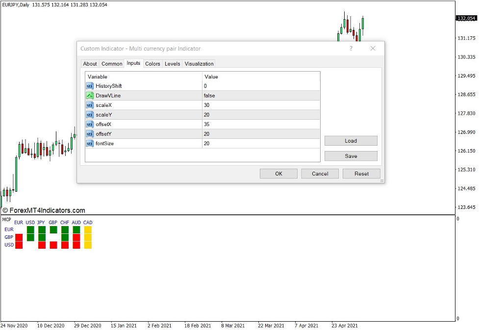 The Multi Currency Pair Indicator has a few options within its settings, most of which are aesthetic modifications on the matrix.