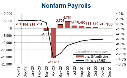 The December nonfarm payroll gain is pegged at 100k, with downside risk from coronavirus headwinds and seasonal factors that expect a normal holiday season. Initial claims were elevated in the BLS survey week, while continuing claims fell -767k between the November and December survey weeks. The jobless rate is expected to tick up to 6.8% from 6.7% in November, alongside a 0.1% December hours-worked rise with a 34.8 workweek. Meanwhile the hourly earnings are seen to rise 0.2%, as the measure gives back more of the 4.7% April pop with the shift in the composition of jobs back toward lower-paid workers.