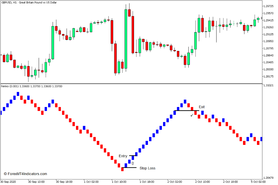 When using the Renko Chart Indicator, traders can trade directly using the Renko Chart Indicator and can disregard the regular price chart.