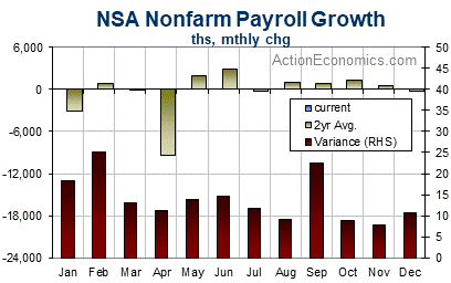 One consequence of the expected annual payroll revisions in early February is that payrolls will show more of a slowing through 2019 into the 2020 downturn, and slightly weaker payroll level at the bottom, before the rebound starting in May. The 178k average payroll gain in 2019 will be lowered, following gains of 193k in 2018 and 176k in 2017. ActionEconomics peg the average payroll drop in 2020 at -624k.