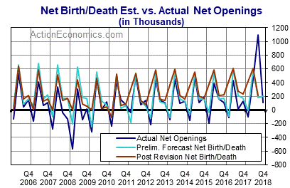 The average net birth/death effect tumbles to -306k in January from -9k in December, -10k in November, and 159k in October. Its 2018 annual high of 260k was in April and its annual low of -198k was in January. After the January low, the month of July marks a summer trough for the average which becomes more volatile in the second half of the year, oscillating between negative and positive territory with a second half trough in September and a peak in October.