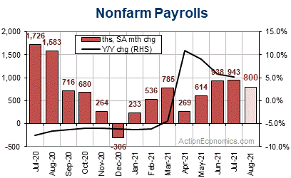 Our August nonfarm payroll estimate sits at 800k, versus July’s 943k rise. The gain is consistent with our 7.0% Q3 GDP growth estimate, assuming an August workweek of 34.8 that leaves a solid 0.6% August rise for hours-worked, alongside a 0.3% hourly earnings gain that extends a 0.4% July rise, and a jobless rate drop to 5.2% from 5.4%. Claims data continue to tighten and producer sentiment remains robust despite some easing, though most consumer confidence measures have continued to fall from Q2 peaks.