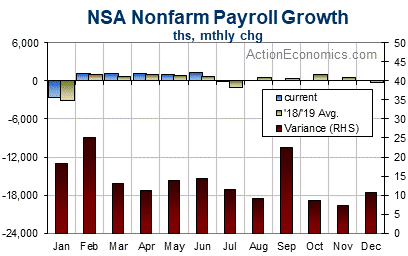 For disruptions to employment from weather as gauged in the household survey, the biggest disruptions occur in the winter months generally with the average peaking in February. There is an additional climb through the late-summer months due to disruptive hurricanes in some years. The ten-year average number of people not working as a result of weather rises to 31k in August from 10k in July, 24k in June, and 42k in May.