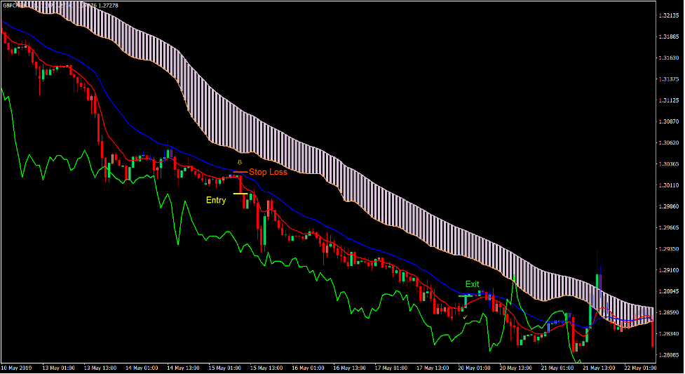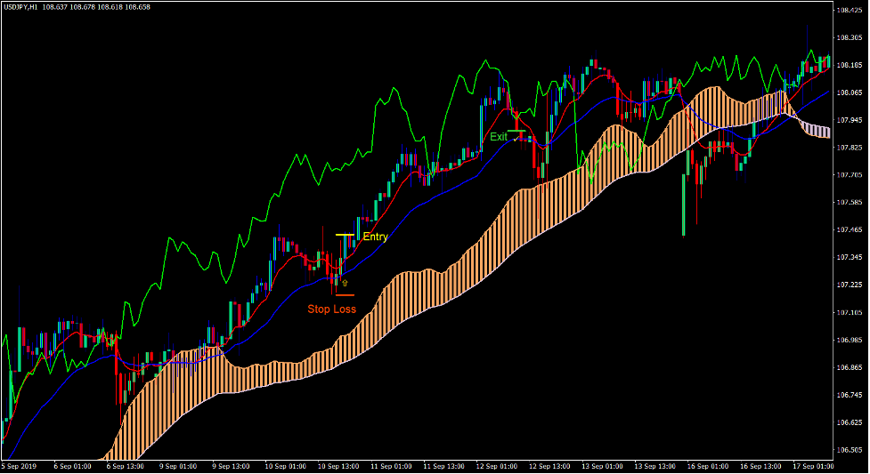 Trend reversal signals are generated whenever the MA Tenkan and MA Kijun lines crossover. However, the signals generated should be filtered based on the direction of the MA Senkou trend. Aside from this, traders should also observe if the lime line is crossing price action which causes the chart to look messy. This indicates that the market is not trending strong enough to warrant a valid trend following entry.