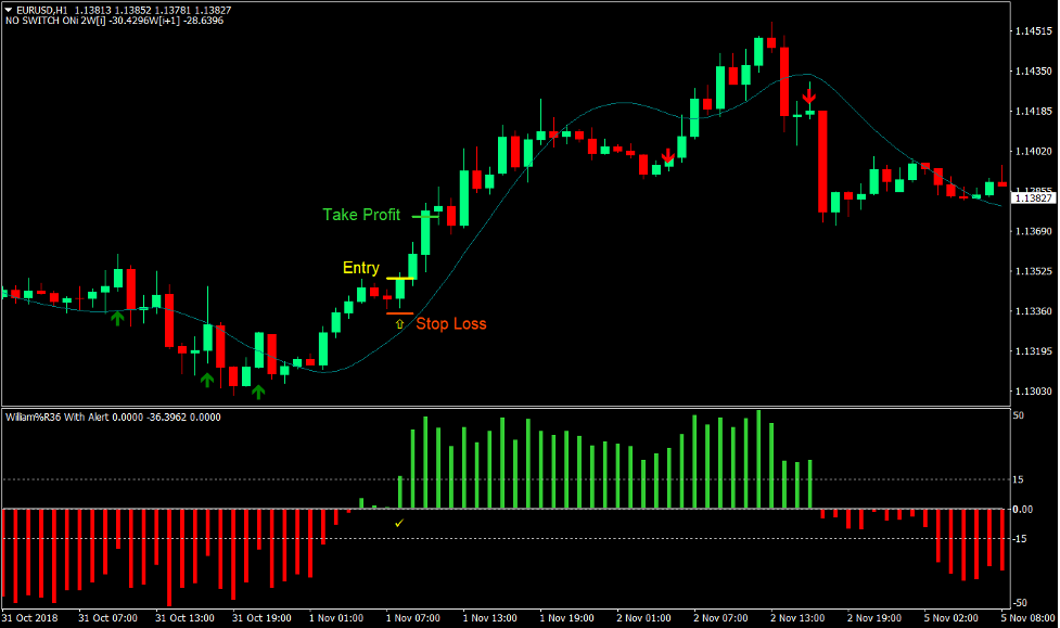 The change in trend should be confirmed by the William36Histogram Waller Test indicator. As price reverses, the histogram bars would start crossing over the midline. However, this doesn’t confirm the momentum of the change in trend. To confirm the change in trend, we would have to wait for the histogram bars to cross over the +/- 15 mark. If the trend is bullish, the histogram bar should cross above + 15, If the market is bearish, the histogram should cross below – 15. This would serve as our entry signal.
